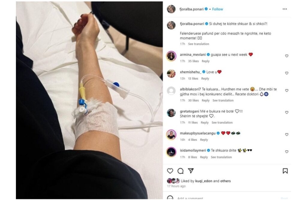 Në postimet e treguara më pas, duket se Fjoralba kishte pësuar një problem shëndetësor në minutat e fundit dhe kishte përfunduar në spital, madje dhe postoi një foto me vigon në krah. Por nuk zbuloi më tej detaje të tjera lidhur me atë që i kishte ndodhur.
