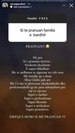 Miss Globe pak aty, me CV më të plotësuar akademikisht dhe profesionalisht qe ke parë ndonjëherë për një 27-vjeçare. Super e dashur, super e përkushtuar, super besnike, super e artikuluar, super protektive. Dreqi e mori si më pranuan?”, shkruan Sara.
