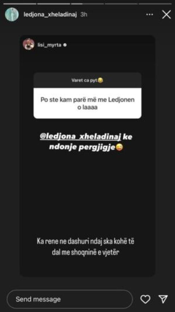 Por siç duket përgjigjia e Ledjonës i nxorri një sekret Lisit: Ka rënë në dashuri ndaj s’ka kohë të dal me shoqninë e vjetër!– ka shkruajtur Ledjona