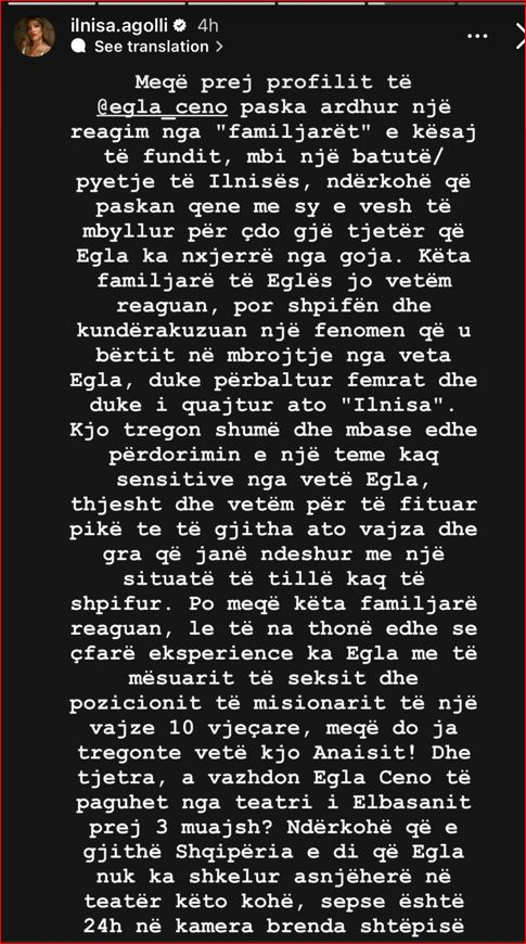 Meqë familjarët reaguan le të na thonë edhe se çfarë eksperience ka Egla me të mësuarit të seksit dhe pozicionit të misionarit të një vajze 10 vjeç, meqë do ja tregonte vetë kjo Anaisit. A vazhdon Egla të paguhet nga teatri i Elbasanit prej 3 muajsh? Ndërkohë që e gjithë Shqipëria e din që Egla nuk ka shkeluar asnjëherë në teatër për këto kohë, sepse është 24 orë në kamera brenda shtëpisë së Big Brother”, shkruhej në postimin e bërë në llogarinë zyrtare të Instagram të Ilnisa Agollit.