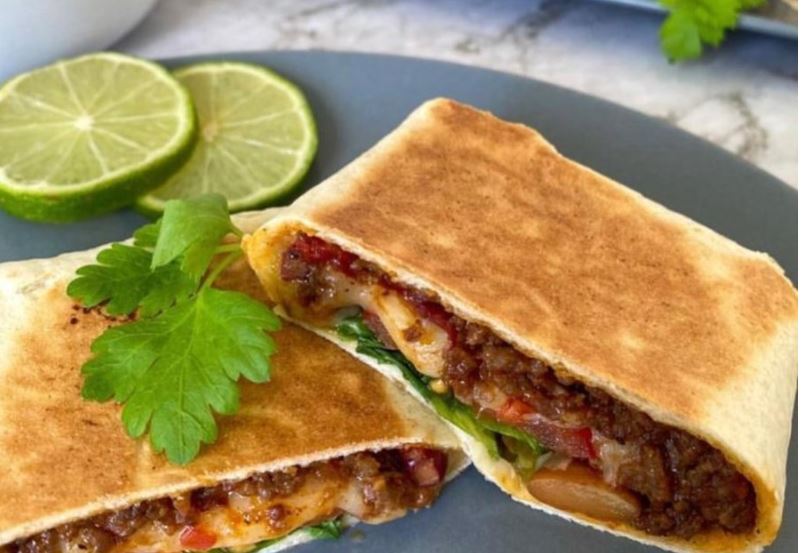E vendosim burriton në një tigan (me pjesën e palosur poshtë) në zjarr të ulët dhe e lëmë për 3-4 minuta. Ky proces shërben që anët e burritos të ngjiten e mbushja të mos dali jashtë. E kthejmë nga ana tjetër edhe për disa minuta të tjera. E lëmë të ftohet pak dhe e presim përgjysmë.