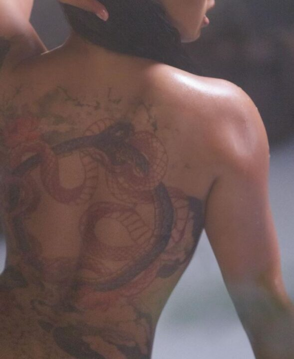 Në foton e parë që ka publikuar, ajo është fotografuar me shpinë të kthyer nga kamera, duke i treguar audiencës tatuazhin në formë dragoi që zbukuron trupin e saj.