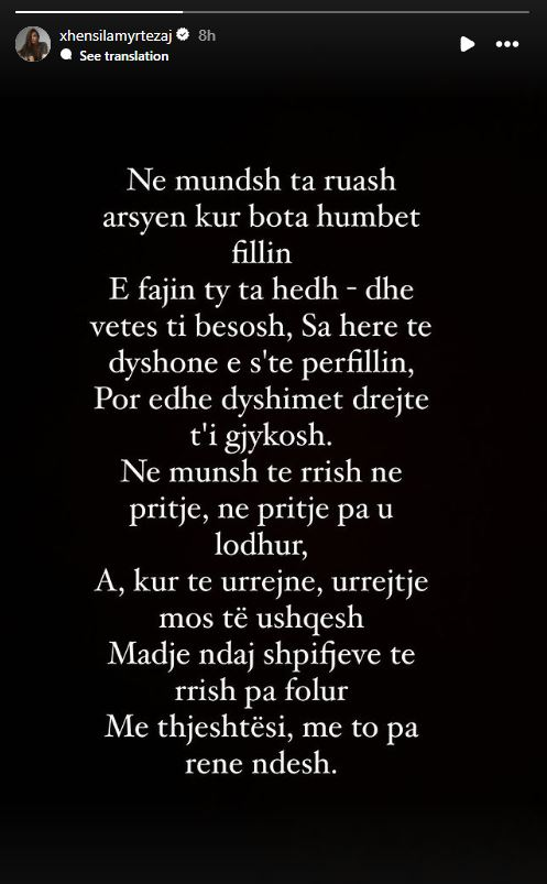 Kjo e fundit, përmes një story në instagram, ka shpërndarë disa vargje të poezisë “Në mundsh”, si një reagim të kritikave dhe akuzave që ajo ka marrë deri më tani.