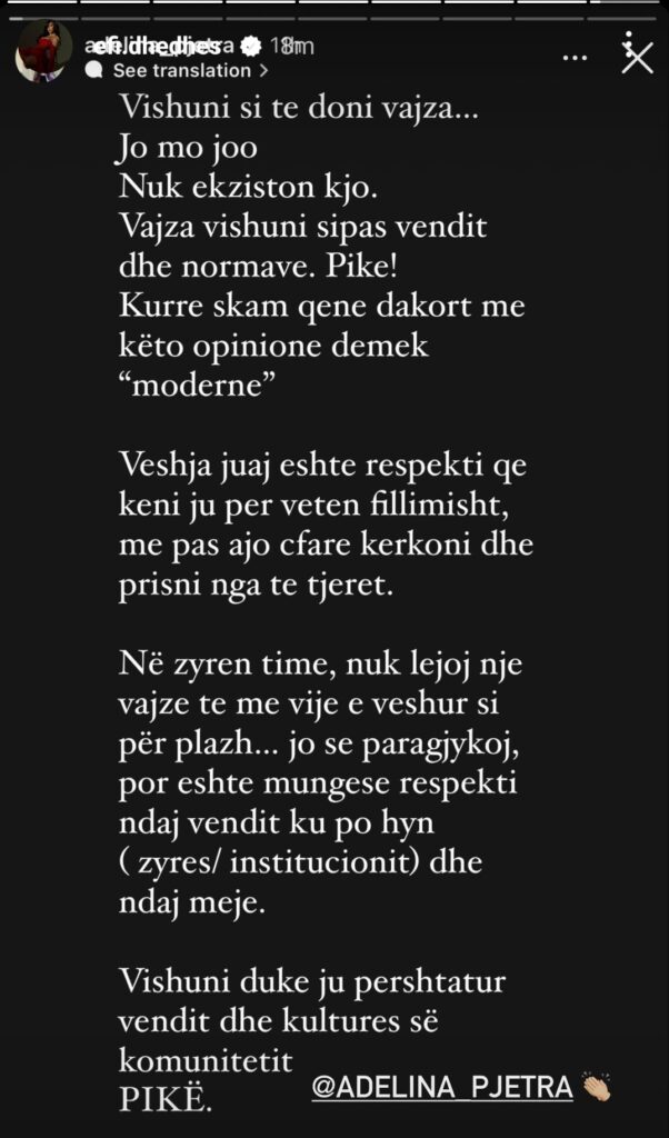 “Vishuni si te doni vajza… Jo mo joo Nuk ekziston kjo. Vajza vishuni sipas vendit dhe normave. Pike! Kurre skam qene dakort me këto opinione demek “moderne”